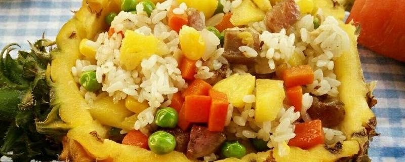 7、将菠萝肉倒入炒饭内,一样拌匀即可。