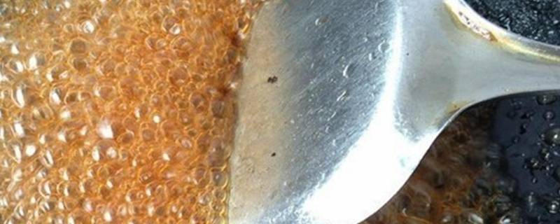 3、用油水结合来炒糖色:锅烧热之后加入适量的食用油和冰糖,快速地敲碎冰糖之后开小火慢慢熬糖色,一直到锅里面出现大气泡,再继续搅糖色气泡就会由大变小了,紧接着糖色的颜色会由浅到深,这个时候我们可以根据自己的需求来控制糖色颜色深浅了。