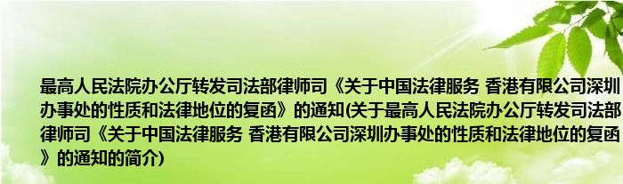 本文关于最高人民法院办公厅转发司法部律师司《关于中国法律服务 香港有限公司深圳办事处的性质和法律地位的复函》的通知的简介就讲解完毕,希望对大家有所帮助。