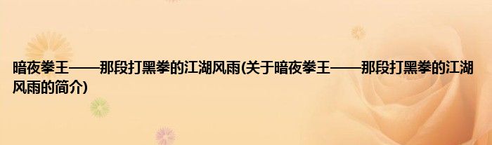 本文关于暗夜拳王——那段打黑拳的江湖风雨的简介就讲解完毕,希望对大家有所帮助。