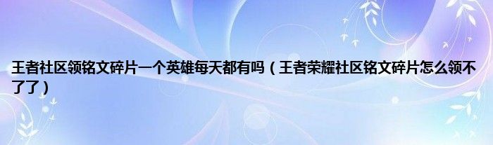 大家好,小常来为大家解答以上问题。王者社区领铭文碎片一个英雄每天都有吗,王者荣耀社区铭文碎片怎么领不了了很多人还不知道,现在让我们一起来看看吧!