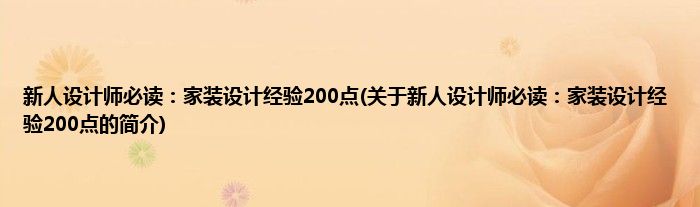 大家好,新人设计师必读:家装设计经验200点,关于新人设计师必读:家装设计经验200点的简介很多人还不知道,现在让我们一起来看看吧!